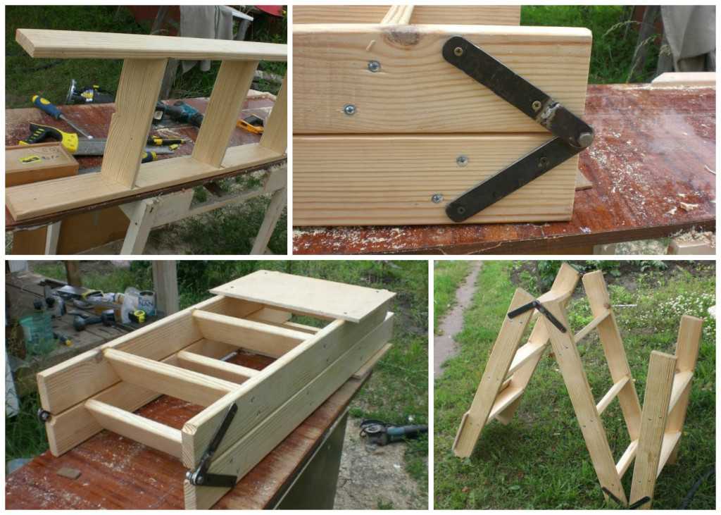 Чтобы выбрать модель лестницы для изготовления своими руками, надо присмотреться внимательно к существующим видам. Раскладные устройства бывают выдвижными, телескопическими, гармошкой, откидными и складными в виде книжки. Последние являются одним из самых простых вариантов для лесенки-самоделки. Принцип их монтажа несложен, если делать все по прилагаемой к ним инструкции. Материал можно выбрать один из двух — дерево или металл.