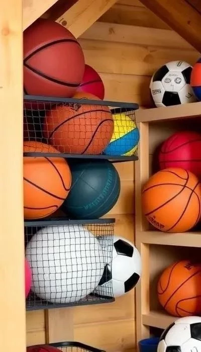 Мячи, гантели и различные аксессуары требуют особого подхода к хранению на чердаке. Для мячей идеально подойдут сетчатые органайзеры, подвешенные к стропилам или закрепленные на стеллажах. Это позволит сэкономить место и обеспечить хорошую вентиляцию. Гантели лучше хранить в специальных стеллажах или на полках, чтобы избежать их падения и повреждений.