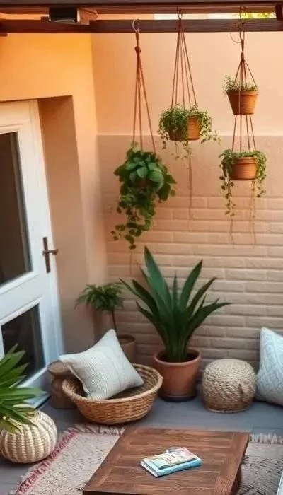 Патио в стиле бохо: Яркий текстиль, плетёная мебель из ротанга, множество растений в горшках создают расслабляющую и творческую атмосферу. Рабочий стол из массива дерева дополнен удобным креслом-качалкой. Гирлянды из лампочек добавляют уюта в вечернее время.