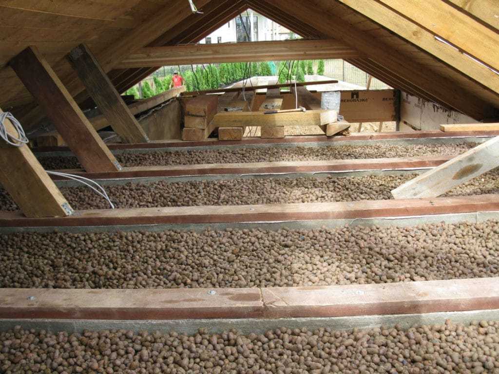 Еще одним материалом для утепления чердачного перекрытия является керамзит. Хотя этот утеплитель используется редко, все же он имеет ряд преимуществ.