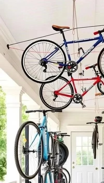 Подвесные системы для велосипедов: Велосипед подвешивается к потолку, что особенно удобно для высоких веранд. Освобождает много места на полу. Существуют системы для двух велосипедов (около 1300 рублей) и более вместительные.