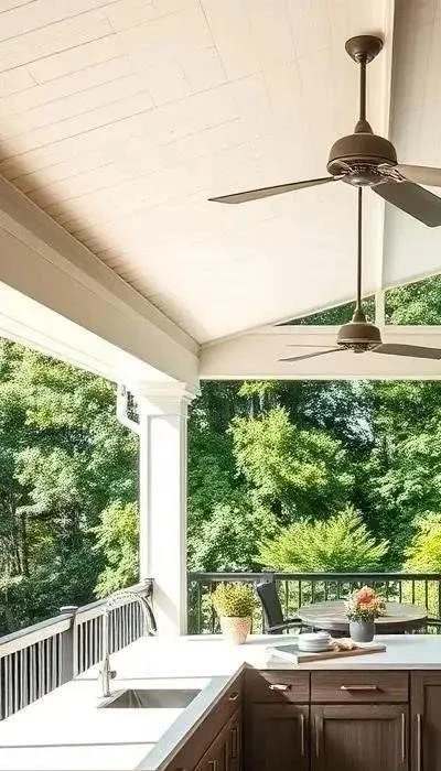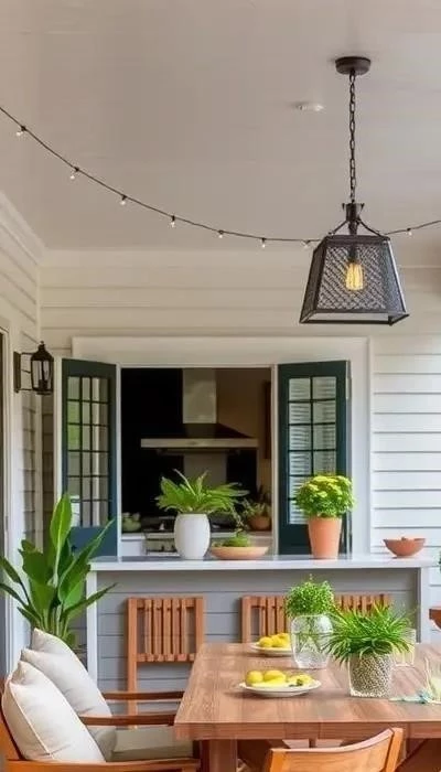 Для летней кухни-веранды критически важны продуманное освещение и гармоничный декор для создания уютной атмосферы. Днем максимально используйте естественный свет: широкие проемы и стеклянные элементы наполнят пространство солнцем и свежестью. Это основа всего визуального комфорта.