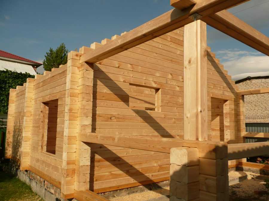 На стены укладывается конструкция крыши из деревянных брусьев, а кровельное покрытие выбирается в зависимости от пожеланий хозяев. На многочисленных фото бань из бруса можно увидеть, какая кровля лучше выглядит для выбранного типа здания.