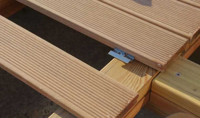 Доски кладут на лагах с пропуском 44 мм. Между досками можно поставить гвоздь для точности. Саморезы могут лопнуть при перегрузках, лучше брать винтовые гвозди, их шляпки покрывают мастикой. Обработку досок выполняют в ходе укладки.