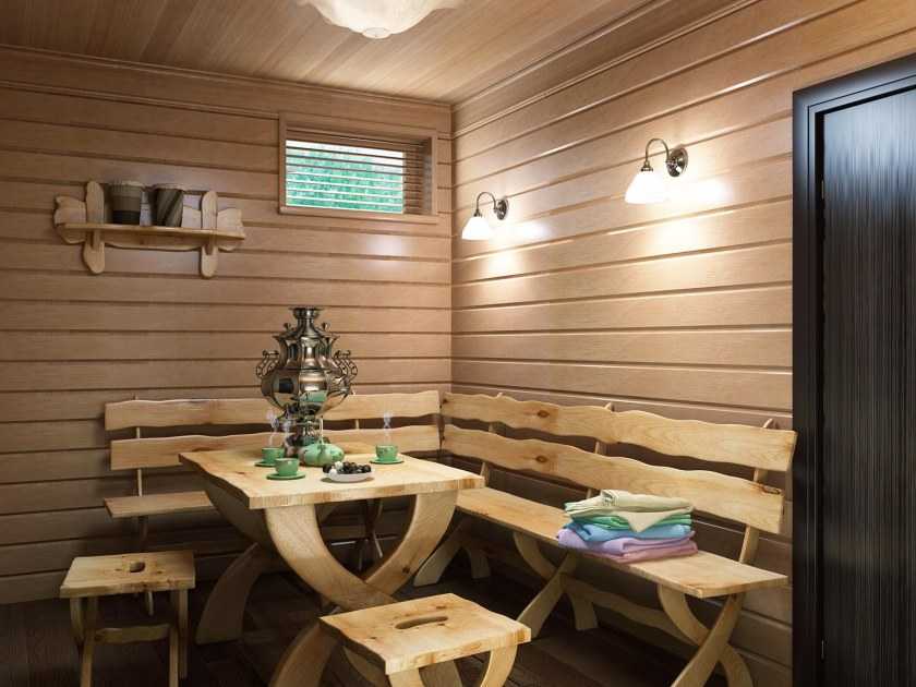 Главный акцент следует делать на декор, украшая помещения такими традиционными аксессуарами, как самовар, венички, шапочки. Неплохо смотрятся в современных интерьерах бань и светильники в декоративных оправах. Комнату отдыха лучше всего обшивать вагонкой светлых оттенков, а полы облицовывать плиткой. В таком помещении обычно устанавливается на стенах и потолке несколько ламп.