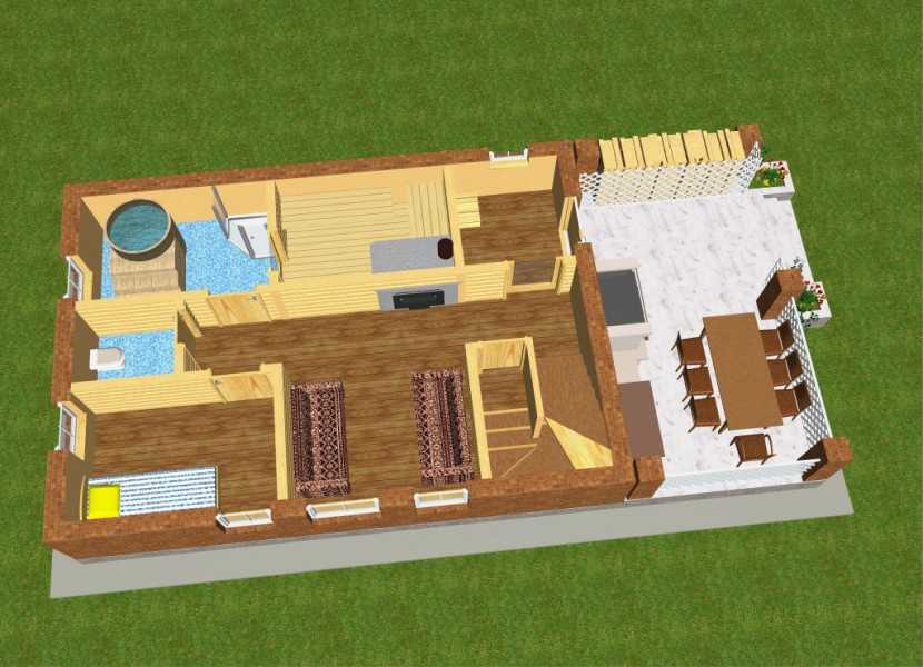 Планировка помещения очень обдуманная и удобная и включает в себя наличие не только парилки, санузла и комнаты отдыха, но даже спальни.