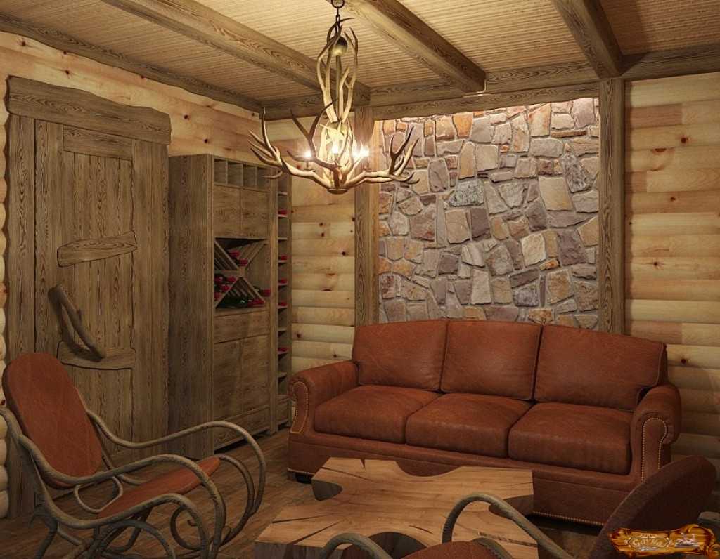 К исконно русским традициям можно отнести и бани, украшенные в стиле рустик или «леший». Эти два исконно русских варианта характеризует меблировка крайне грубого исполнения. В стиле леший можно использовать имитацию лесных пней и коряг, деревянную утварь топорной работы, покрытую темным лаком. Стиль рустик – это нарочито подчеркнутая грубая обработка древесины на стенах и потолке помещения.