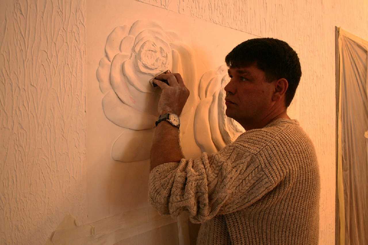 Если с рисованием у вас все в порядке и есть желание стать начинающим скульптором, то для нанесения барельефа не обязательно делать формочки. Создайте объемный узор из цветов прямо на стене, пользуясь такой технологией: