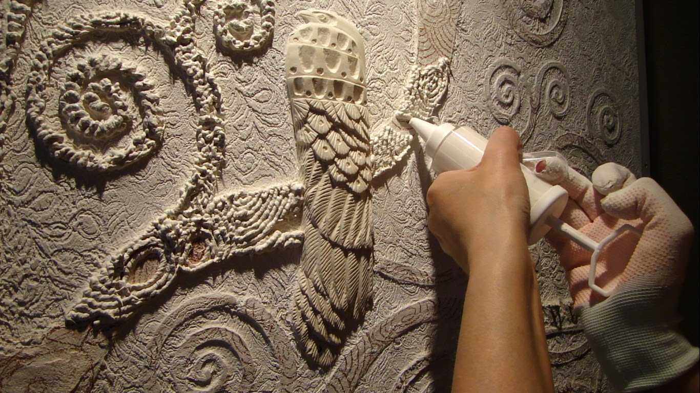 Раствором для барельефа может быть гипс или шпаклевка густой консистенции. В гипсовый раствор можно добавить клей ПВА, который замедляет процесс затвердевания. При помощи резиновых шпателей, которые иногда обрезаются до нужного размера вручную, наносится базовая основа. Все остальные тонкости рисунка формируются металлическими лопаточками небольшого размера.