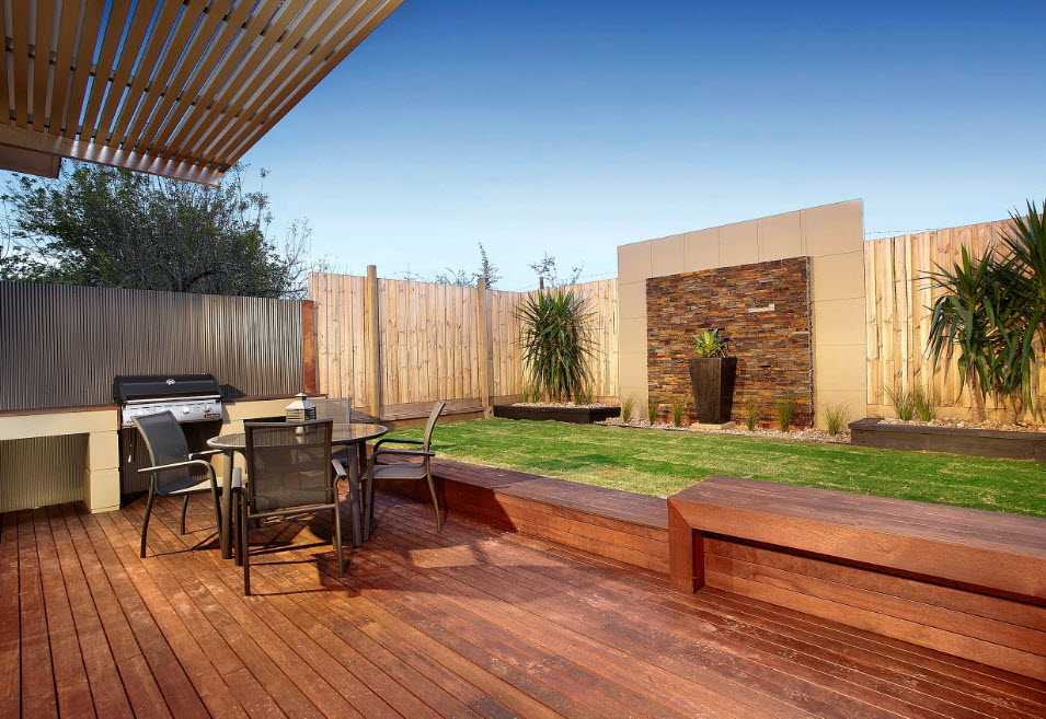- Открытая площадка – используется в случае, если на участке мало свободного пространства, а семейные застолья проводятся достаточно редко. Для обустройства используют барбекю, небольшой стол и легкий навес.