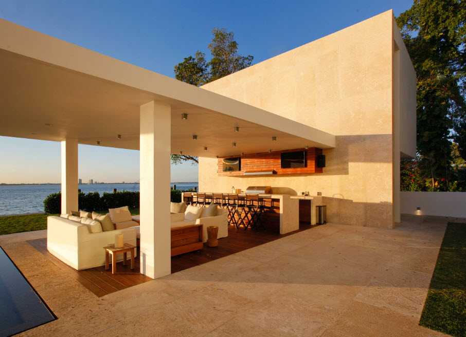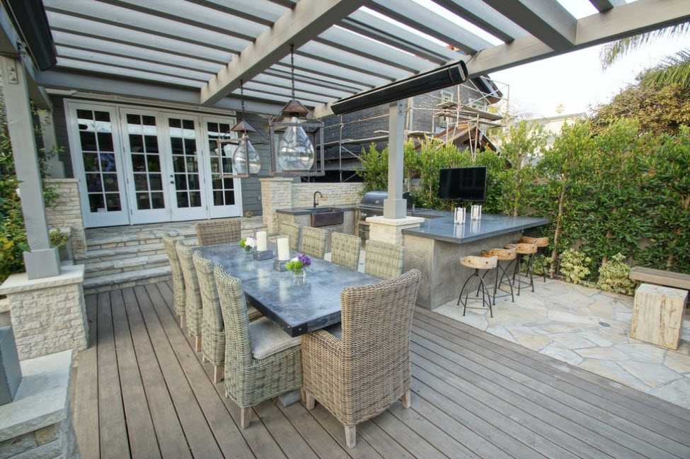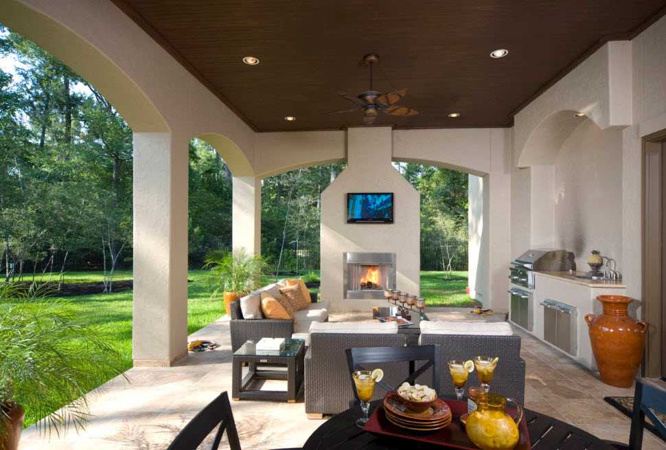 - Закрытая зона – можно использовать на протяжении всего года, для обустройства используют стационарную установку, стены и навес. Зачастую подобной зоной отдыха выступает терраса или беседка. При желании их можно преобразить в летнюю столовую, где можно хорошо посидеть в независимости от погоды.