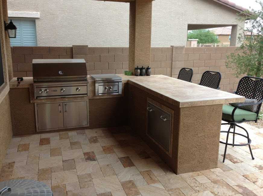 Сделать такое сооружение можно и у глухой стены, и у той, на которой есть окно или дверной проем. Второй вариант выгоднее тем, что хозяйке будет намного удобнее подавать блюда к столу гостям, собравшимся в пристройке.