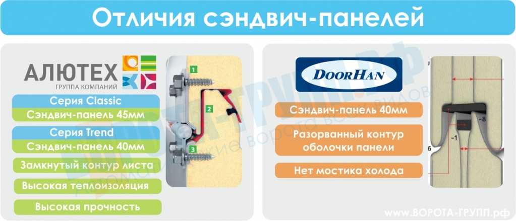 Все сэндвич-панели ворот Дорхан имеют толщину 40 мм. Толщина сэндвич-панели ворот Алютех зависит от серии ворот. Серия Classic имеет 45-мм панель, а новинка 2015 года, серия Trend (Тренд), выпускается с 40-миллиметровой сэндвич-панелью.