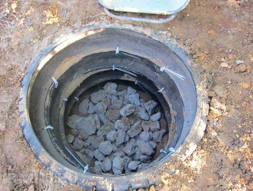 - Треть ямы засыпают мелким гравием, вторую треть гравием средней фракции и третью – крупной фракцией. По периметру устанавливают опалубку из досок или кирпича и заливают фундамент, оставив в центре отверстие под слив.