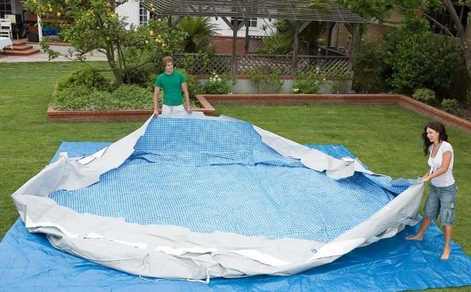 - если бассейн прямоугольной формы, то необходимо ровно разложить чашу, разгладить складки и свернуть края по обеим сторонам, чтобы получился квадрат,
