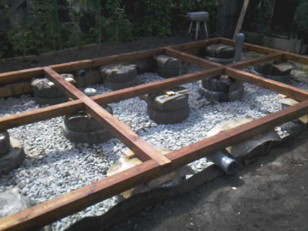 Шаг свай – 4 м, смонтировано 9 штук, по углам, по середине сторон и в центре будущего сооружения. Для ростверка использован брус 150х100 мм, из него же выполнены лаги. Шаг лаг – 0,5 м