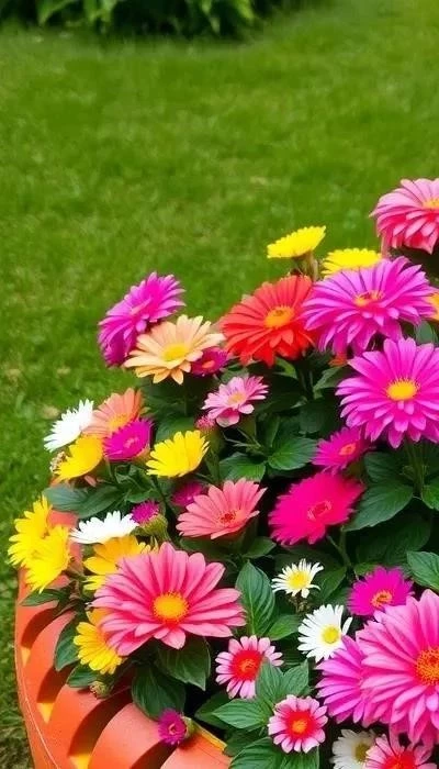 - Модерн: Клумба из металла с геометрическим узором, заполненная яркими однолетниками.