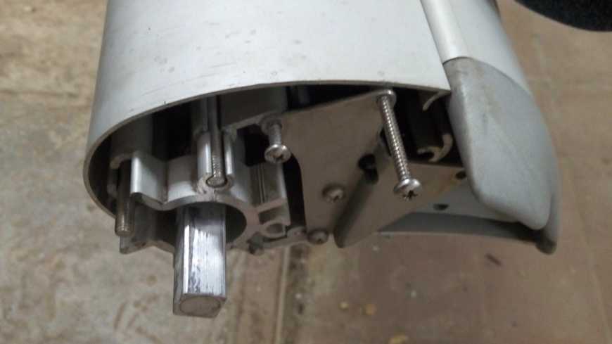 Согласно сделанному чертежу собрать вал с редуктором и ответной частью, прикрепить полотно, так как труба у вас не специальная профильная, крутим на саморезы, предварительно приклеивая на двухсторонний скотч.