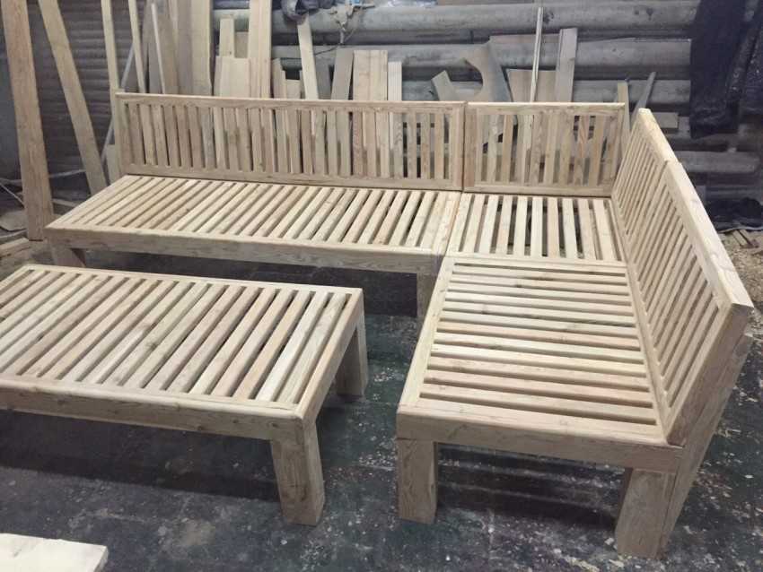 Все детали будущей мебели должны быть отшлифованы сначала шлифовальной машинкой, затем наждачной бумагой, чтобы не было заноз. Брус сначала нарезают нужной длины, затем делают каркас, к которому крепят доски, в соответствии с чертежом.