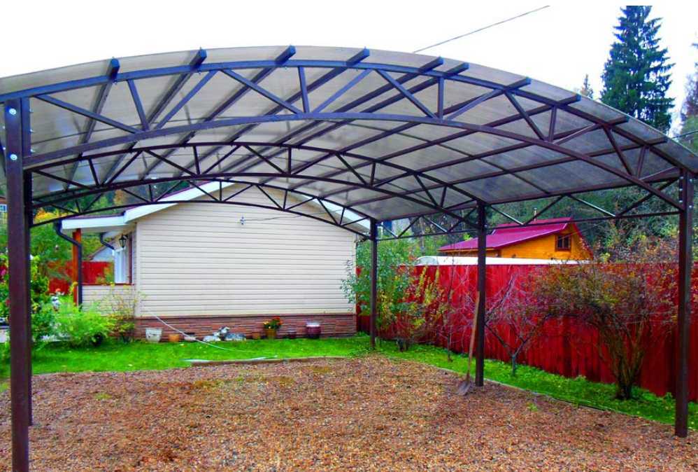 Отличаются листы поликарбоната тем, что они легкие, поэтому их монтаж можно сделать самостоятельно. Для крепления подходят шурупы с широкой шляпкой (ПШ) и шуруповерт. Материал позволяет соорудить крышу любой конфигурации, но в разумных пределах. Больше всего из поликарбоната делают крыши в виде арки. Этим материалом допустимо зашить боковушки навеса, защитив внутреннее пространство от непогоды.
