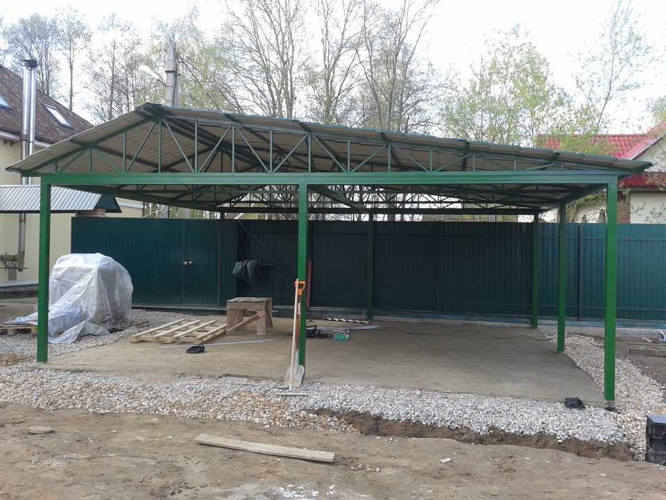 Самый простой и недорогой способ сделать площадку под автонавесом — засыпать ее гравием. Для этого надо будет снять дерн, вкопать бордюр, насыпать щебень и хорошо его утрамбовать с использованием трамбовочных платформ. Тогда площадка будет жесткой и колеи не образуются.