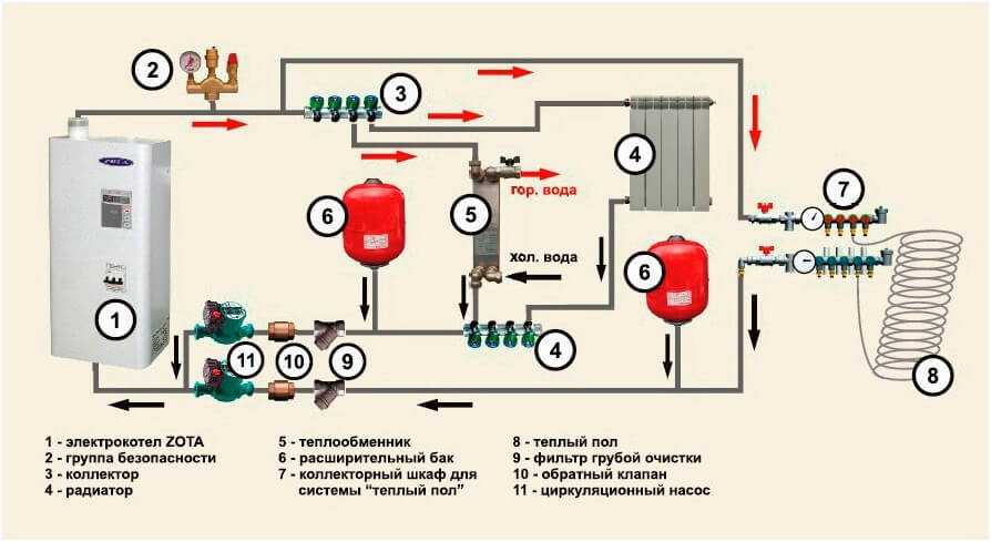 Исходя из модификации таких устройств, используются разнообразные схемы подсоединения электрокотлов к отоплению. Наиболее популярной является многоуровневая система отопления с комбинацией приборов нагрева в виде радиаторов и системы «теплый пол».