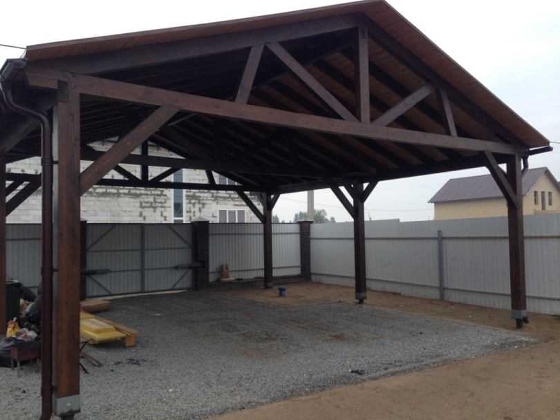 Крыша – это заключительный этап. Материал кровли в первую очередь должен зависеть от ее формы. Сперва надо произвести крепеж всех деревянных частей. После этого можно положить на них кровельный материал. К примеру, для навесов, у которых небольшой наклон кровли, подойдут профильные листы из металла.
