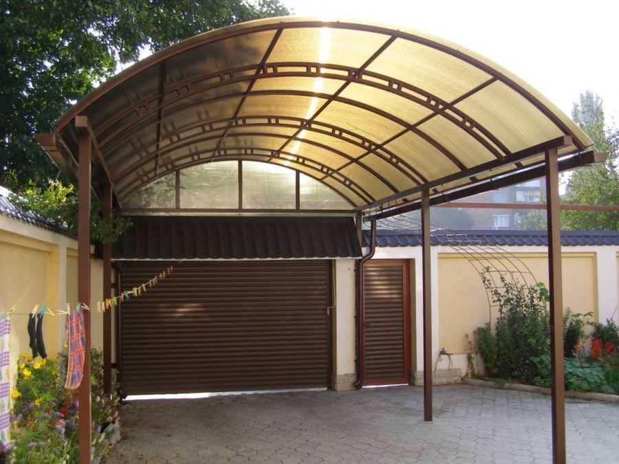 Опорный навес из поликарбоната пристроенный к дому, фото криволинейной крыши