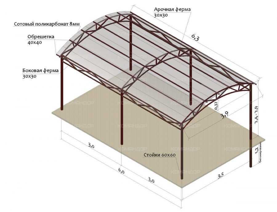 Пример, как делать навес из поликарбоната своими руками, чертежи арочной конструкции