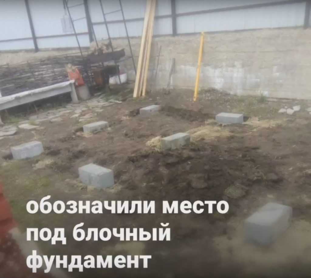 Основание беседки состоит из блочного фундамента. Используется 9 фундаментных блоков 20 на 20 на 40 см, выставленных строго по уровню. Для того, чтобы выставить их ровно, необходимо заранее подготовить площадку под фундамент — убрать большую траву, мусор, корни и тому подобное.