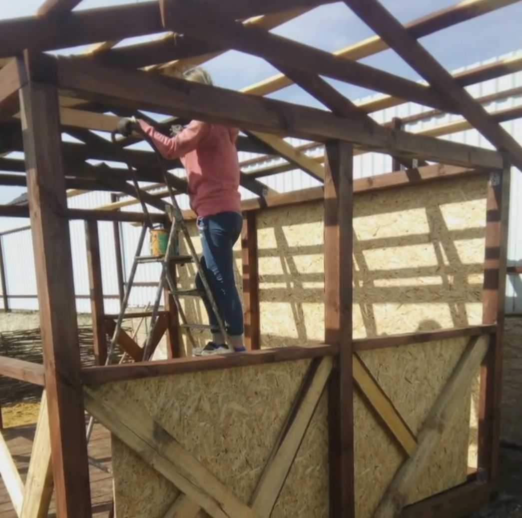 Заднюю стену беседки было решено закрыть, чтобы создать некий уют внутри помещения. Для этого использовались ориентированно-стружечные плиты, которые помимо глухой задней стены закрыли нижние проёмы в беседке.