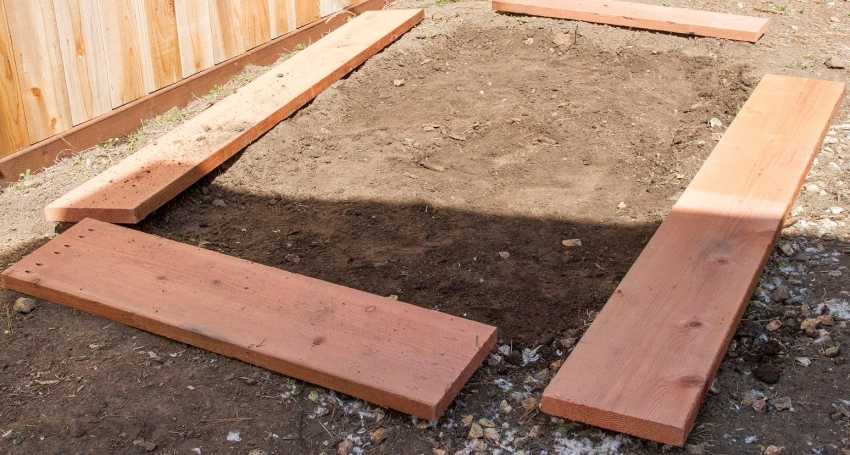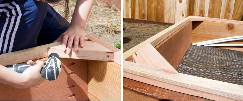 В качестве основания будет выступать общее ограждение грядок. Изготавливается оно из досок, скрепляемых саморезами в прямоугольник.