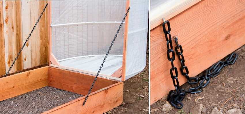 Для удобства, низкий парник можно сделать с открывающимся верхом, закрепив две части с помощью веревки и цепи