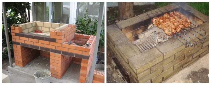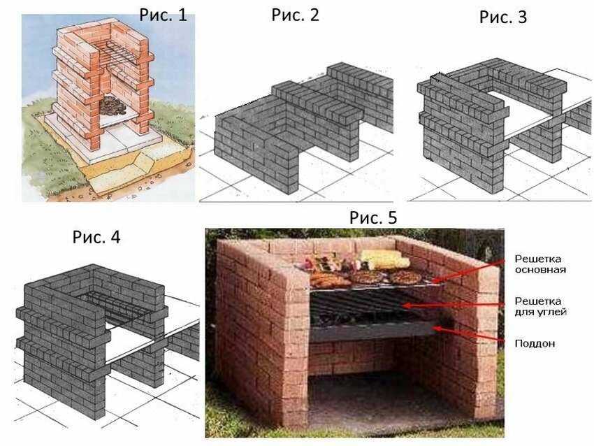 После окончания подготовительных работ можно переходить непосредственно к строительству стен мангала. Есть два способа выкладки: в форме буквы «П» или «Е». Оптимальной считается высота конструкции в 1 м. В простом варианте между боковыми сторонами мангала надо установить две чугунные решётки. На верхней можно готовить, на нижней — поддерживать огонь (над ней необходимо вывести дымоход). Между ними должно быть расстояние в 250 мм.