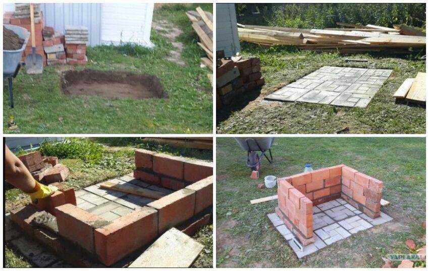 На ровной площадке выкладываются 2-3 стенки высотой 50-60 см или прямоугольник. Между рядами кирпича укладывают решетку — колосник, на который будут помещаться дрова. При их сгорании зола падает сквозь отверстия решетки и не препятствует теплоотдаче.