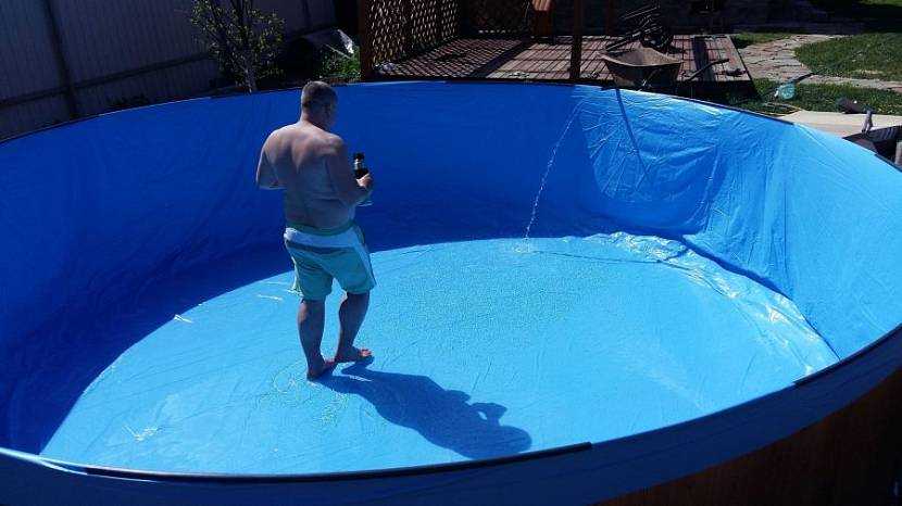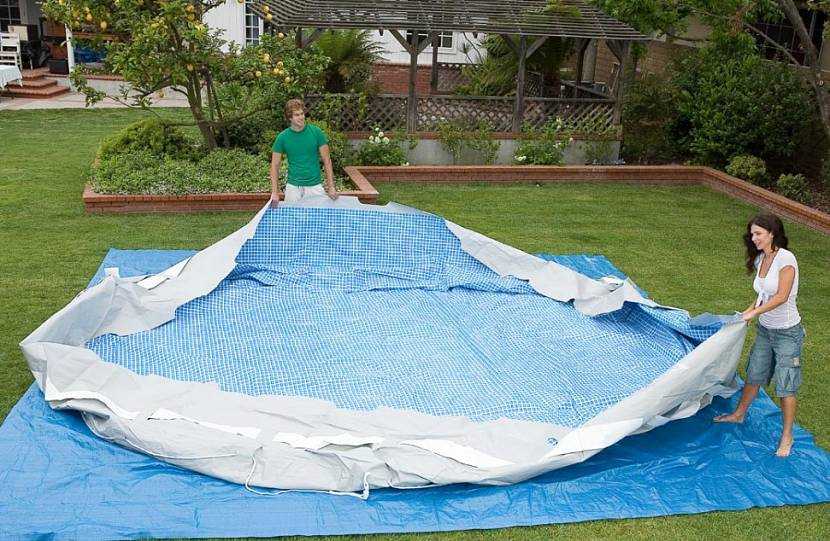 Обустройство бассейна на даче нужно производить в безветренную и солнечную погоду. Прежде, чем начинать монтаж, стоит развернуть чашу, и выложить ее на солнце. Материал прогреется, и станет пластичным и мягким. Это облегчит работу, а также позволит избежать преждевременных повреждений и образования складок.