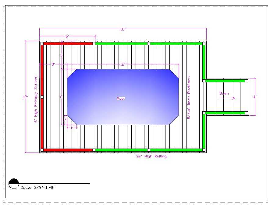 На первой иллюстрации показан эскиз бассейна, вокруг которого будет построена деревянная терраса. Так как в конкретно этом случае бассейн не погружен в грунт, а находится над поверхностью земли, то платформа вокруг него будет достаточно высокой, и на террасу будут вести ступеньки. По всему периметру деревянной террасы будут установлены оградительные конструкции: