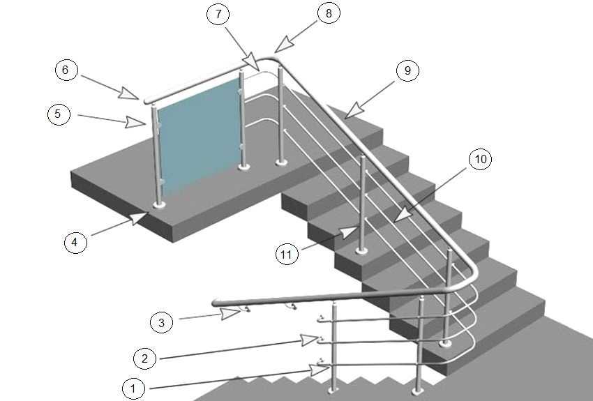Элементы конструкции перил из нержавеющей стали: 1 — тетиводержатели, 2 — кронштейны поручня, 3 — кронштейны настенные, 4 — низы стоек, 5 — стеклодержатели, 6 — заглушки, 7 — повороты тетивы, 8 — повороты поручня, 9 — поручни, 10 — тетива, 11 — стойки