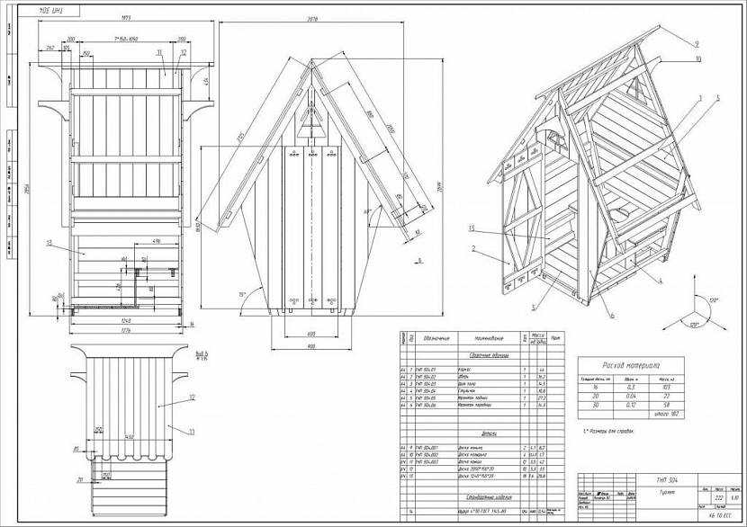 Один из вариантов, представленный стандартным чертежом дачного туалета серии шалашей, возвышается на 2,5-3 метра по высоте и занимает площадь 1,2 (2.00) х 1,0 (1,5 м) по основанию.