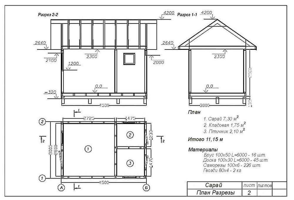 Чертеж сарая с односкатной крышей