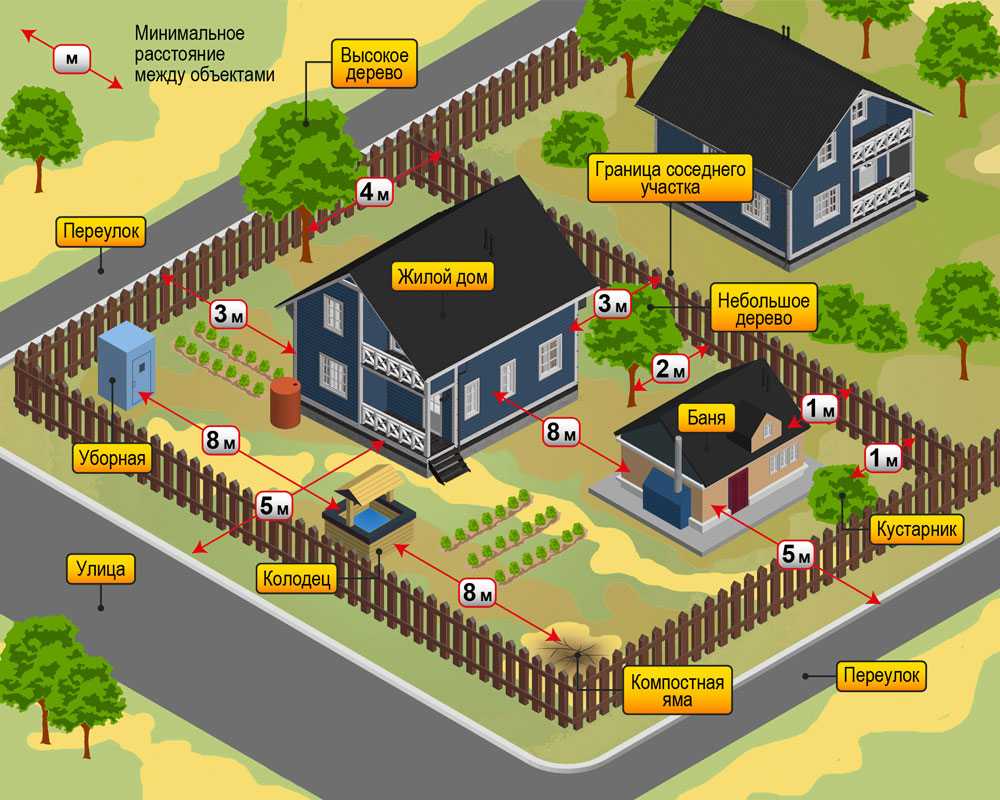 - 5 м между любой хозяйственной постройкой и улицей или проездом.