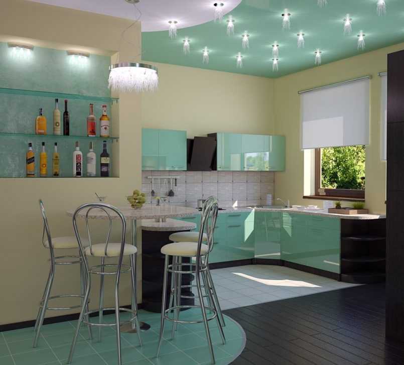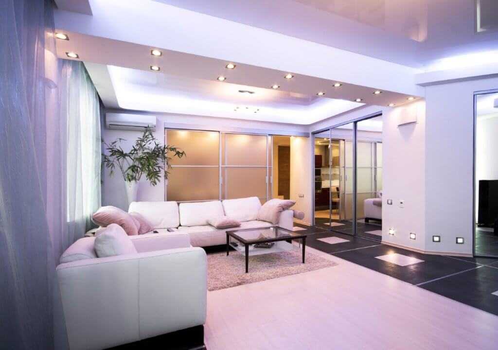 Удобно зонировать пространство при помощи разноцветной потолочной подсветки.