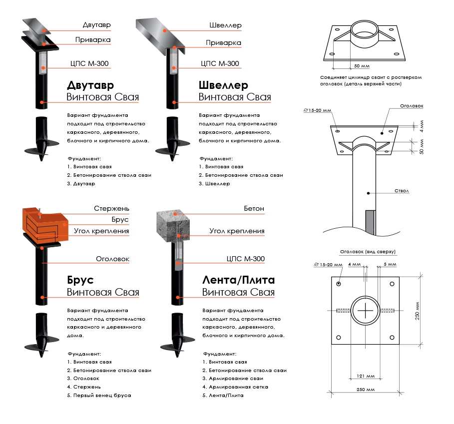 Полые стволы винтовых свай заполняются бетонным раствором марок М200-М300, это необходимо для предотвращения коррозии стенок изнутри и увеличения их несущей способности свай. Далее к стволам привариваются металлические оголовки, сварные соединения в обязательном порядке покрываются защитными грунтовками.