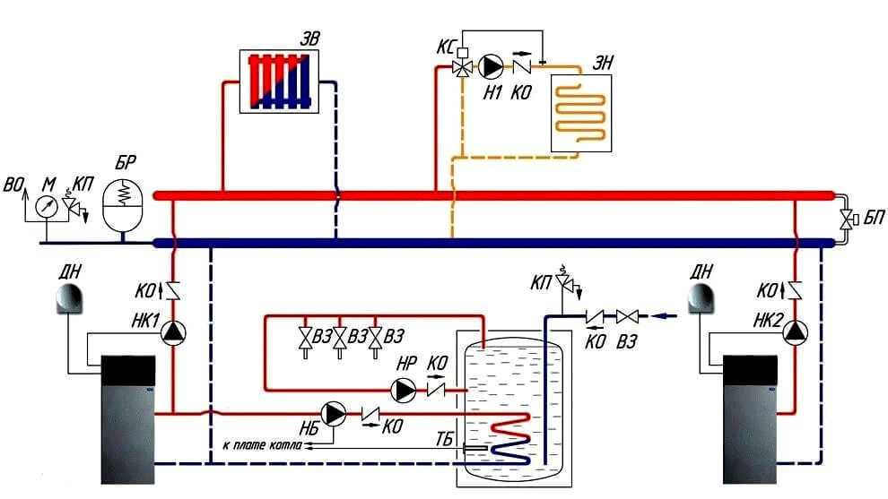 Подобная схема котельного агрегата предполагает включение бойлера косвенного нагрева через насос НБ и НР, радиаторное отопление через насос НК1 и НК2, теплый пол — через Н1.