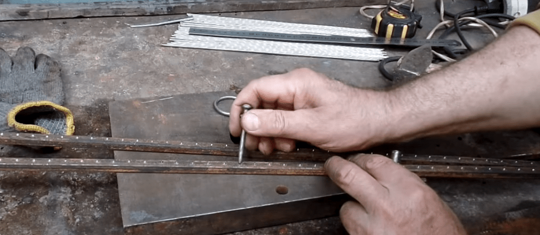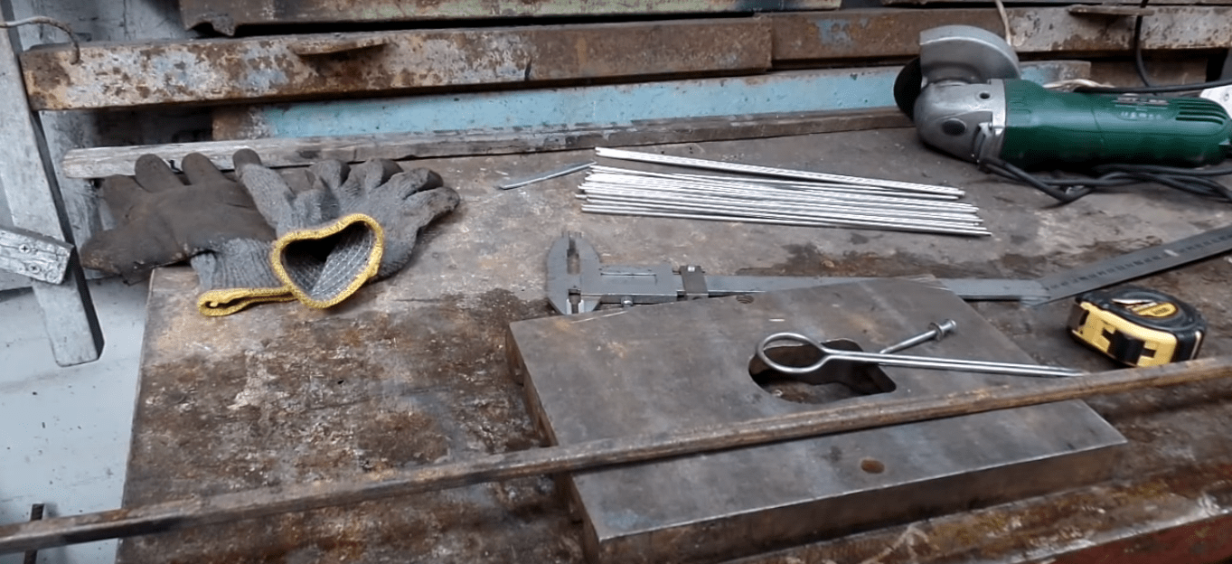 - Потребуется два стальных прута размером сечения 10х8 мм. Они будут использоваться для создания горизонтальной основы. Отрезаем от прутьев детали длиной 45 см.