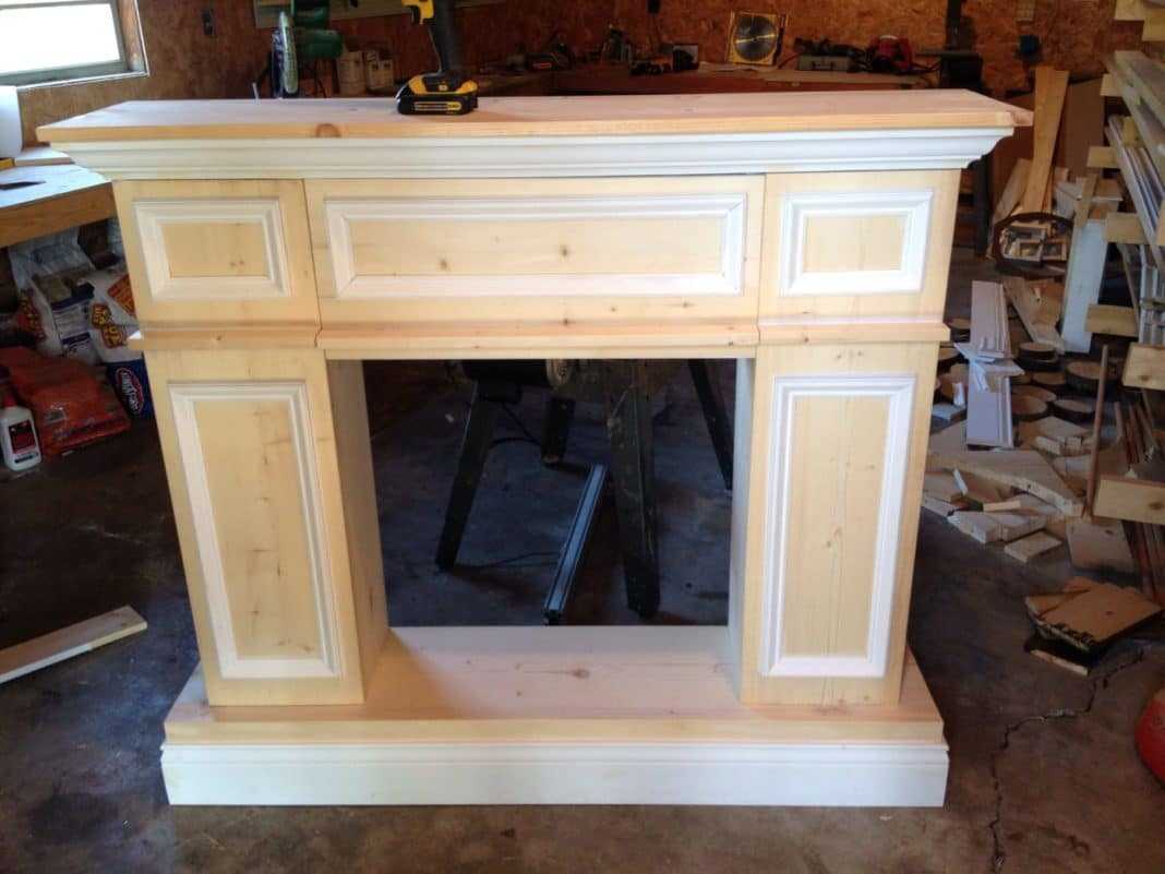 - Приступаем к сборке каркаса. Бруски соединяем между собой саморезами (вкручиваем их шуруповертом). Проверяем правильность сборки по чертежу. На доску-основание прикручиваем ножки для мебели. Крепим каркас к доске – основанию. Устанавливаем каминную полку.