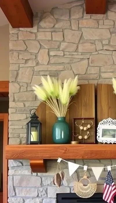 4. Рустик и природная красота: Грубые текстуры и натуральные материалы. Разместите на полке коряги, камни, сухие цветы и керамические изделия ручной работы. Используйте теплые оттенки коричневого и зеленого.