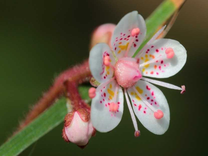 Особое украшение Камнеломки — это россыпь ярких пятилепестковых цветочков белой, розовой, красной или малиновой окраски. Они достигают в диаметре не более 2 см, но зато растение может похвастаться очень обильным цветением. Цветки распускаются на длинных цветоносах, одиночно или собранными в метельчатые соцветия, гордо возвышаясь над зеленой массой кустика.