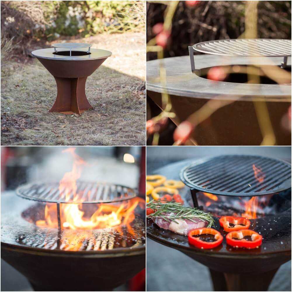 Круглый мангал устанавливают на лужайке или по центру беседки как отдельный объект либо монтируют в столешницу.