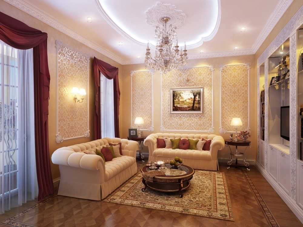 - Обильное декорирование. Классический интерьер чаще всего представляется как богато декорированный, роскошный, с обязательной лепниной на потолке, резной мебелью и расшитым золотыми нитями текстилем.